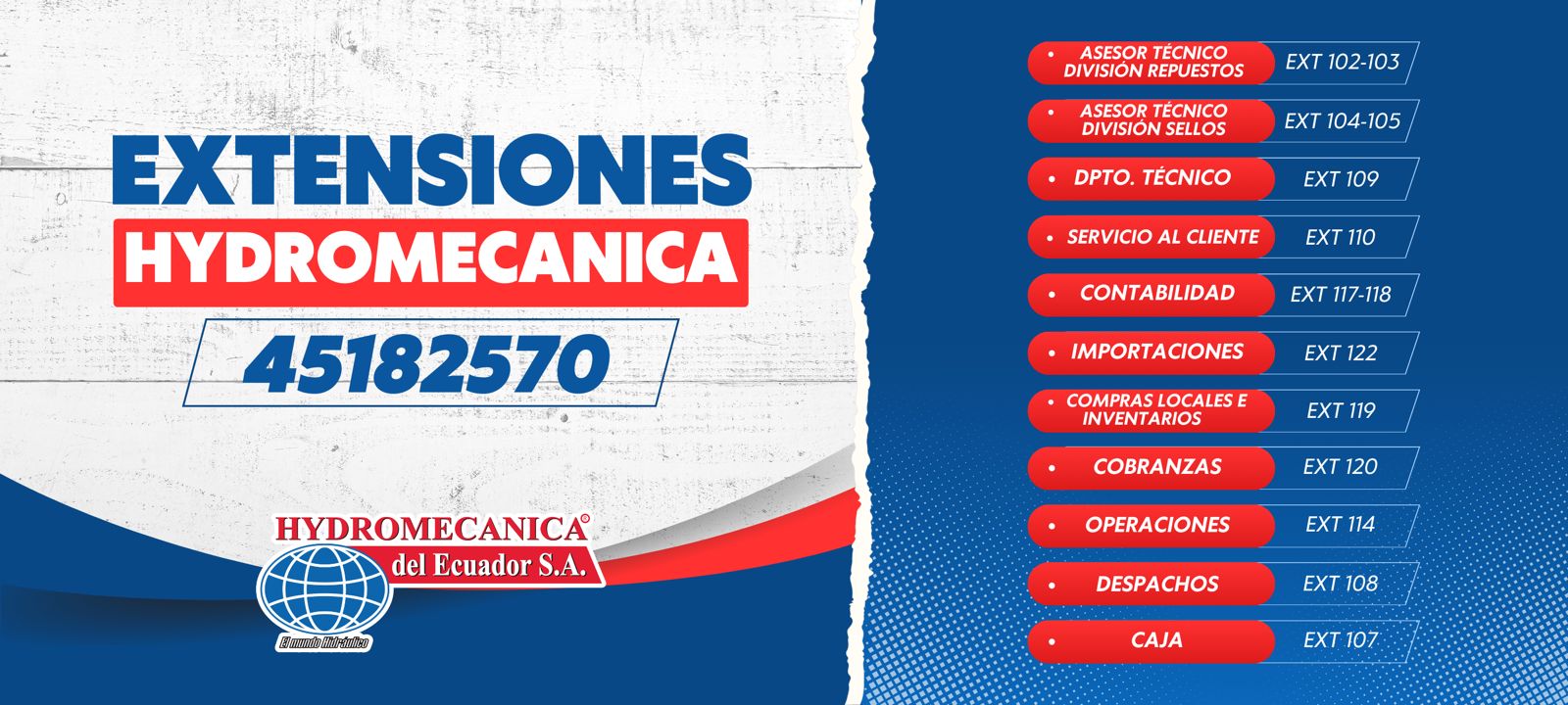 Clemente Ballén 1707 y Av. Del Ejercito. Email: ventas@hydromecanica.com Teléfono Principal: 04-5182570, para mayor información a: Asesor técnico división repuestos / ext 102-103. Asesor técnico división sellos / ext 104-105. Departamento técnico / ext 109